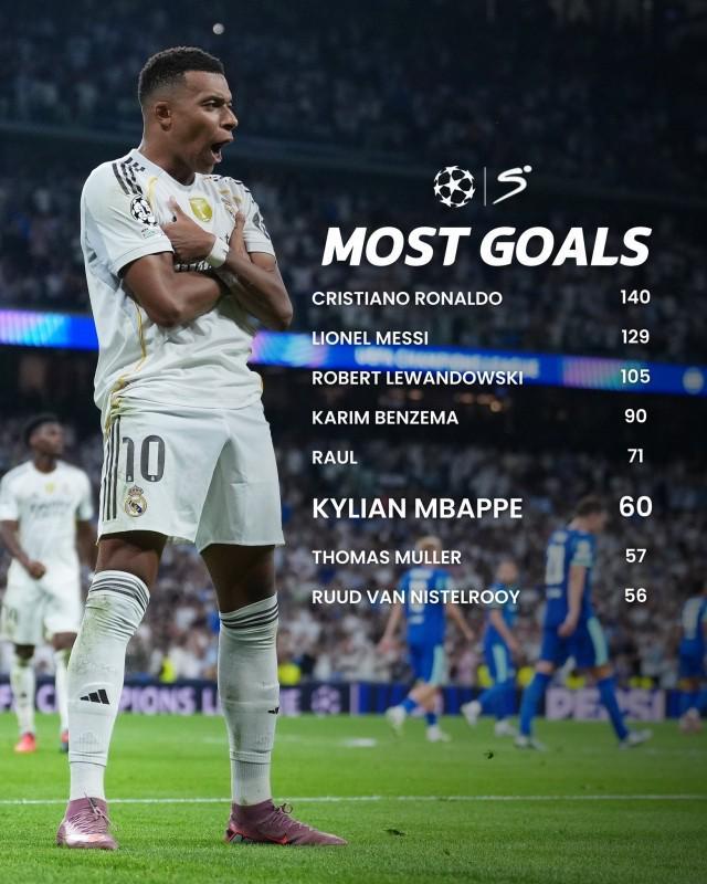 皇马5比0阿拉木图凯拉特,姆巴佩上演帽子戏法,成为欧冠历史上第6位欧冠60球俱乐部成员。 打进60球,姆巴佩用了89场比赛,比他的偶像C罗少9场,比梅西多9场。 同时他也是打进欧冠60球第二年轻的球员: ▪️梅西:26岁86天 ▪️姆巴佩:26岁284天 ▪️C罗:29岁零21天