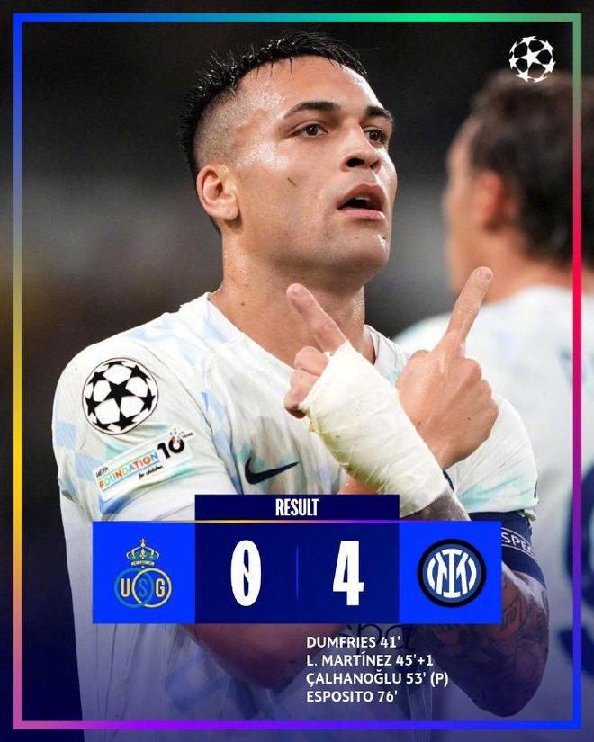 不过球队在第41分钟才打破僵局,邓弗里斯先声夺人,随后劳塔罗再下一城,下半场恰尔汗奥卢和埃斯波西托先后进球锁定胜局。